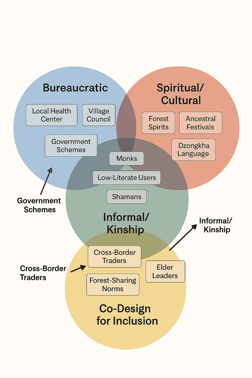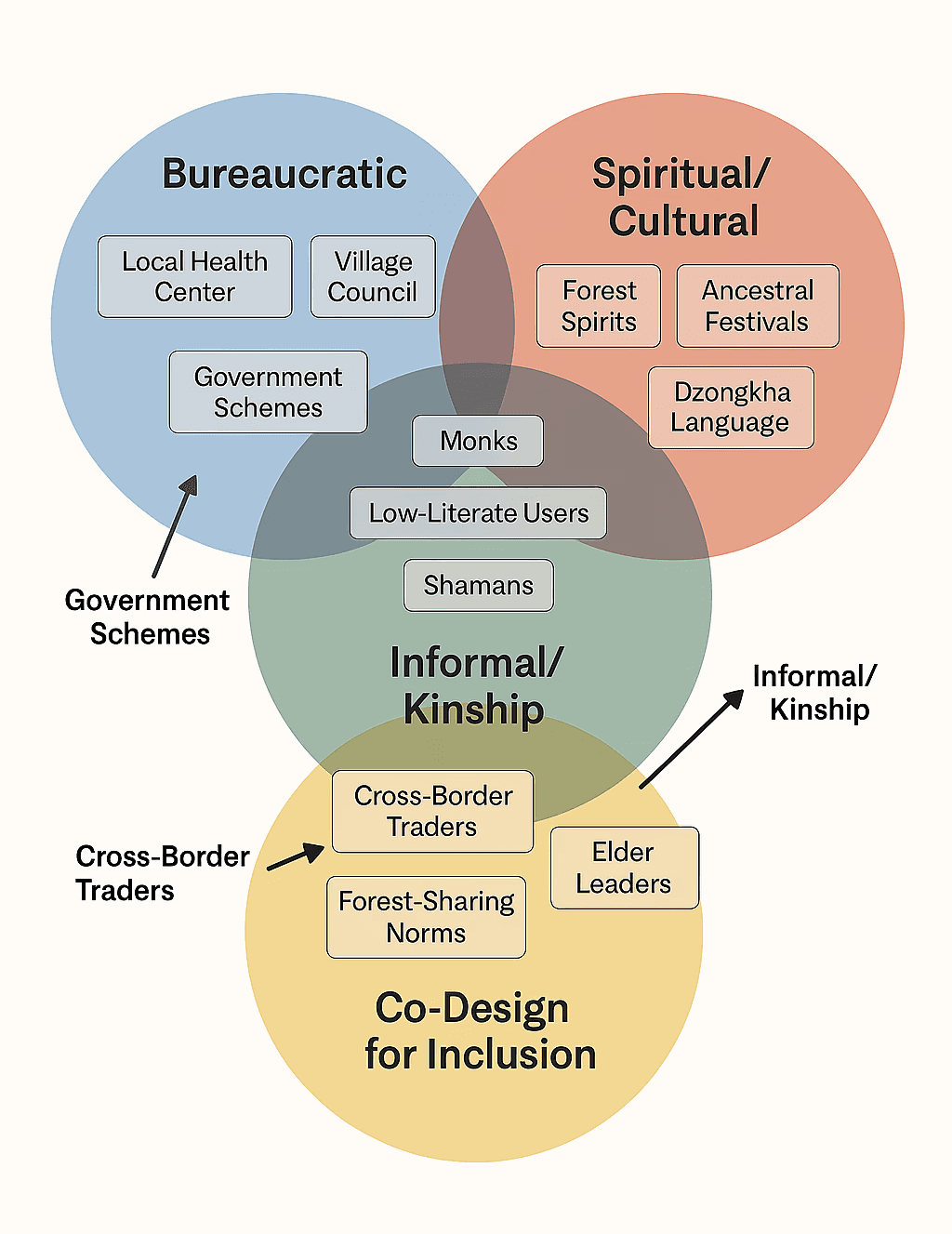 This Venn diagram shows how the Drukpa community navigates overlapping systems bureaucratic (e.g. government schemes), spiritual/cultural (e.g. forest spirits, festivals), and informal kinship (e.g. traders, elders). The intersection points highlight design opportunities for inclusion through cross-system understanding.